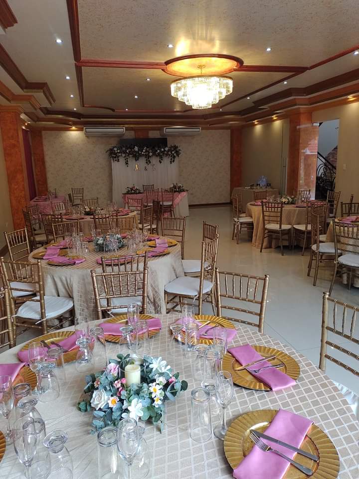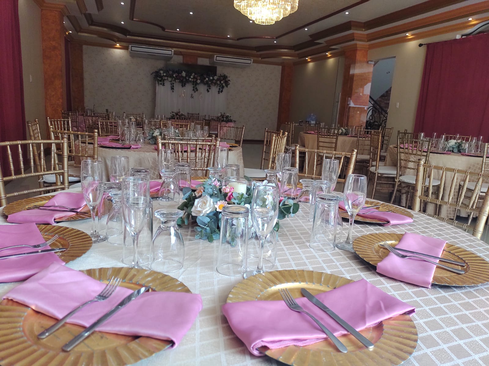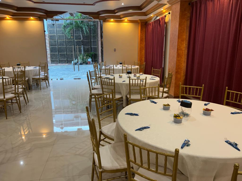 Mesas y sillas cuidadosamente dispuestas, acompañadas de vajilla, cristalería y mantelería que realzan la elegancia de cada ocasión.