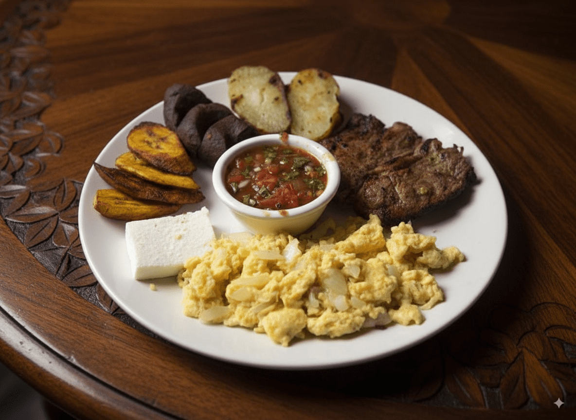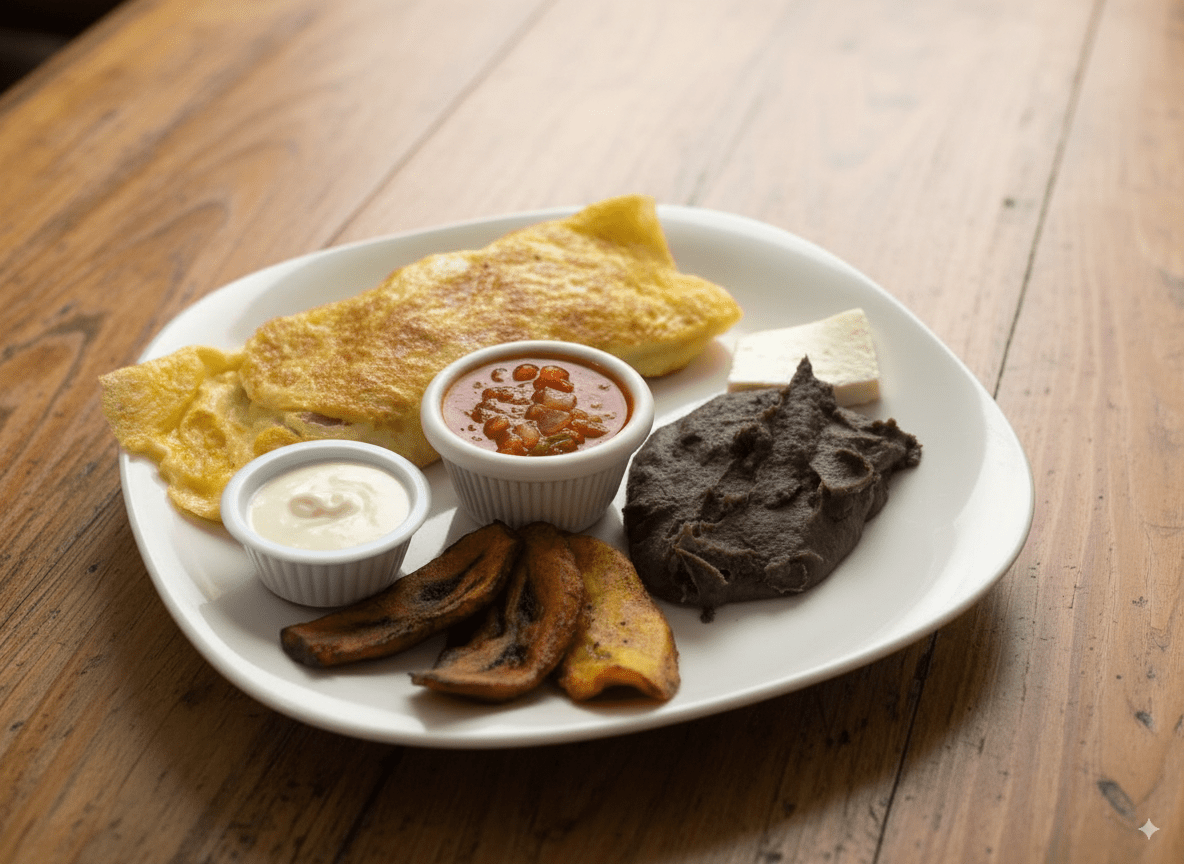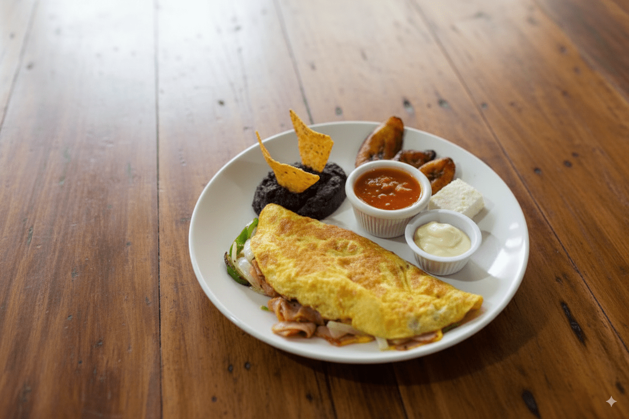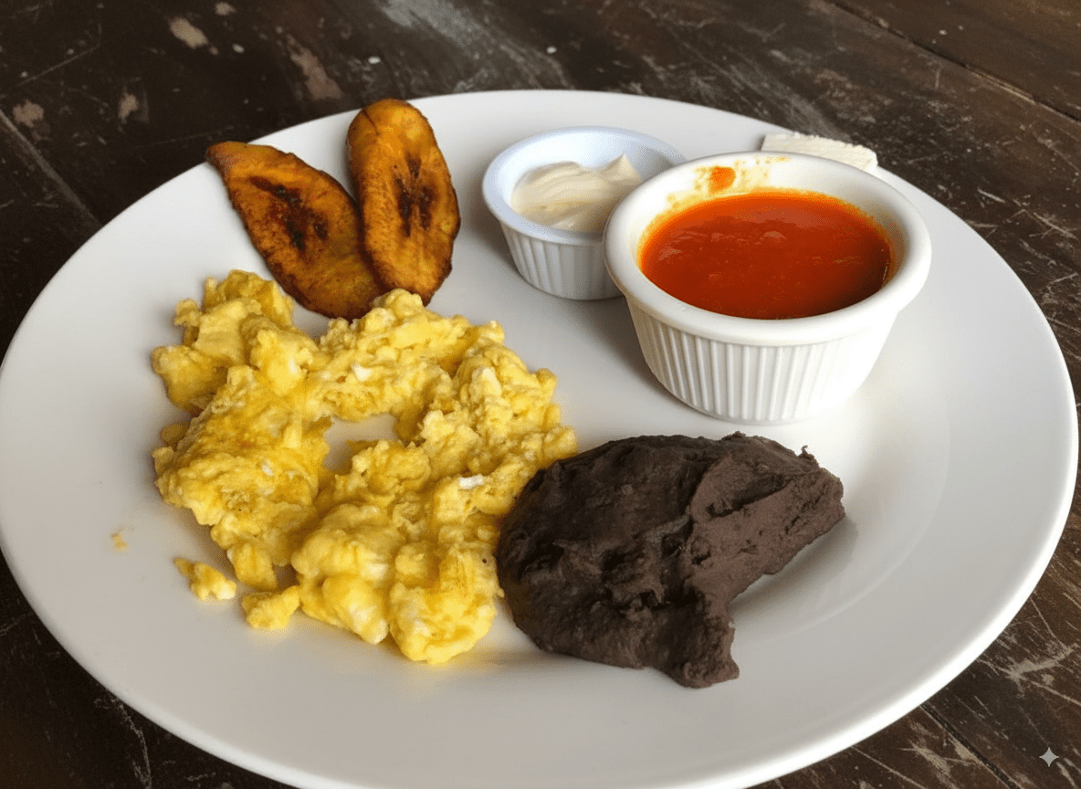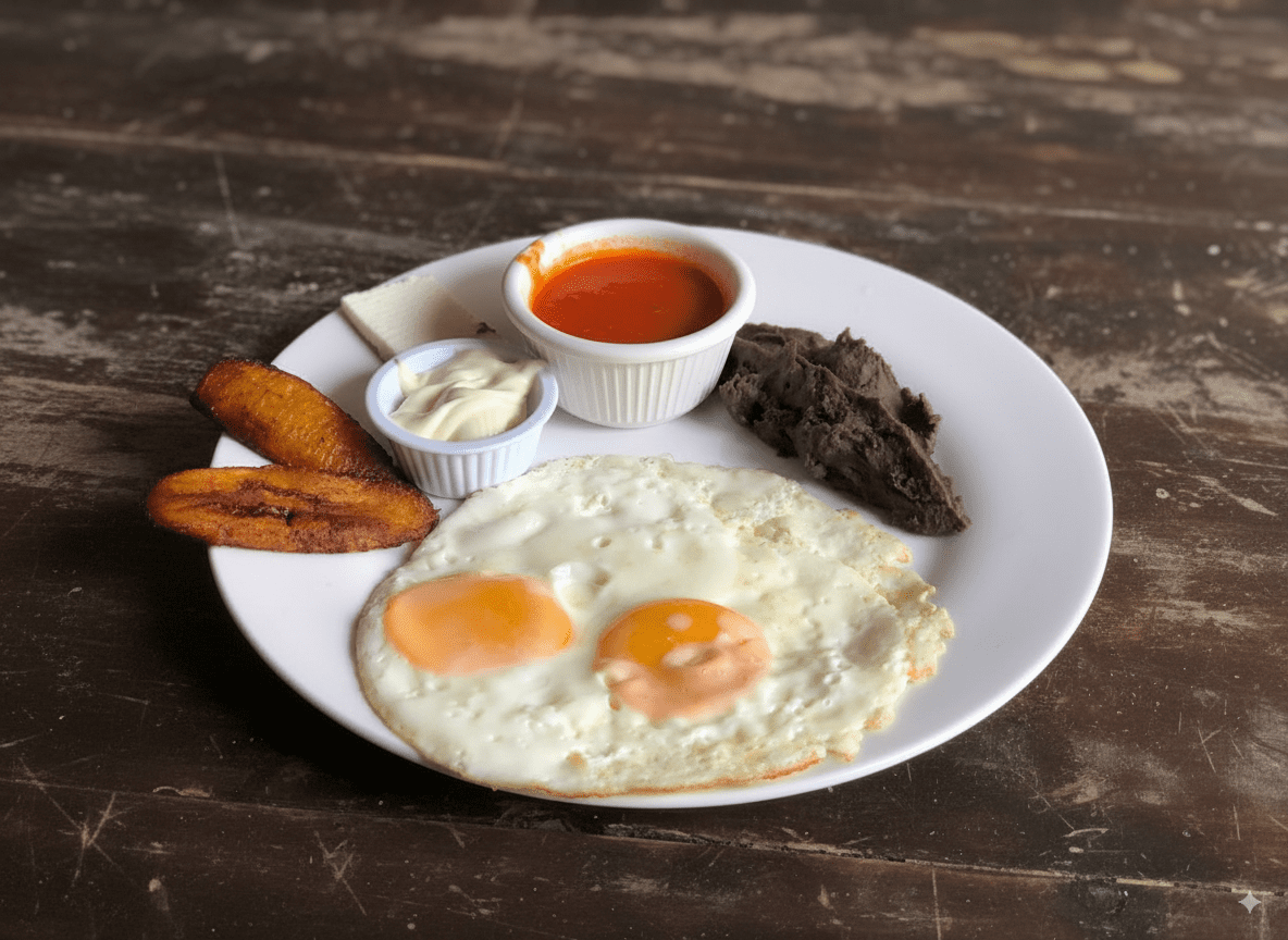 Desayunos con el auténtico sabor chapín: huevos al gusto, frijoles, plátanos, queso, crema y salsa, con opciones que incluyen jamón, salchicha, chorizo o cortes de carne.
