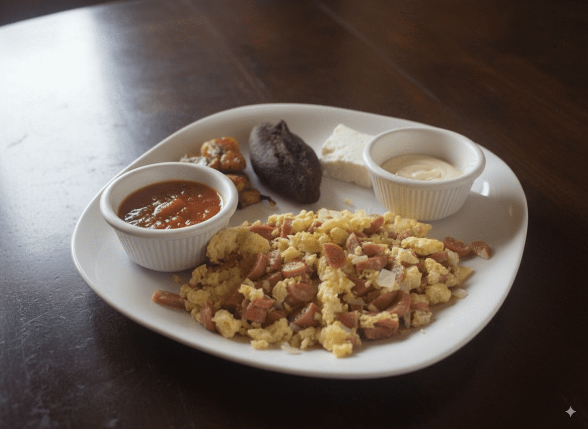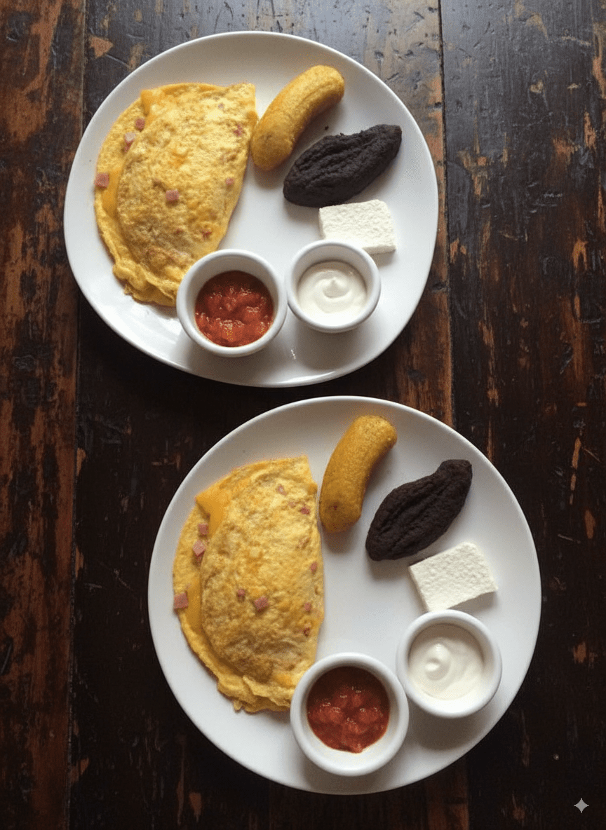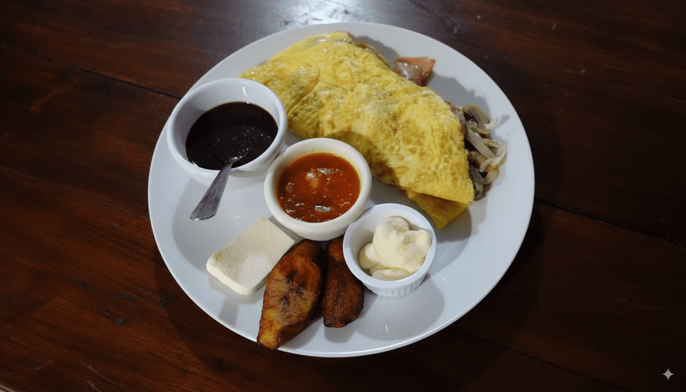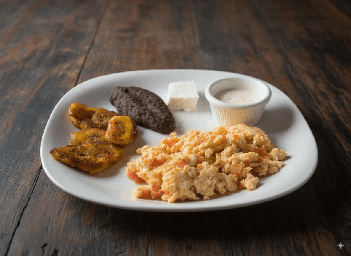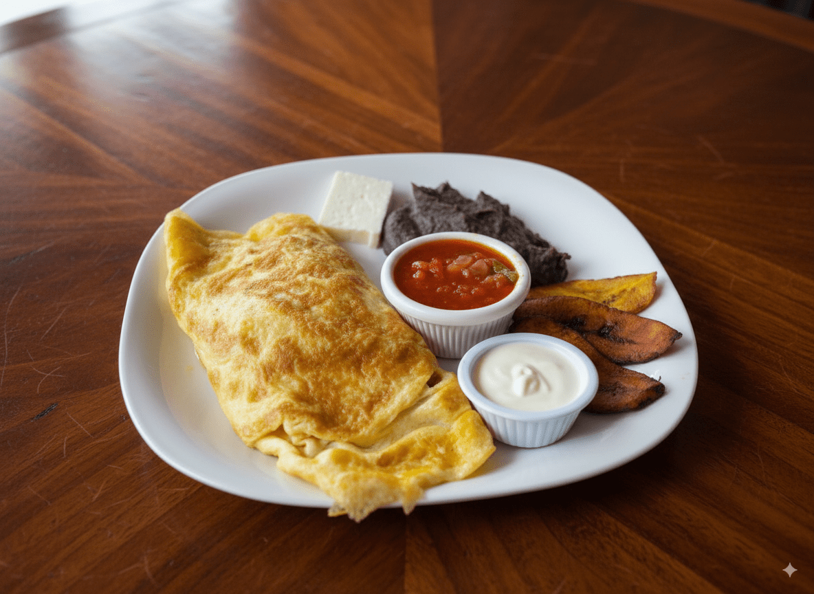 Desayunos con el auténtico sabor chapín: huevos al gusto, frijoles, plátanos, queso, crema y salsa, con opciones que incluyen jamón, salchicha, chorizo o cortes de carne.