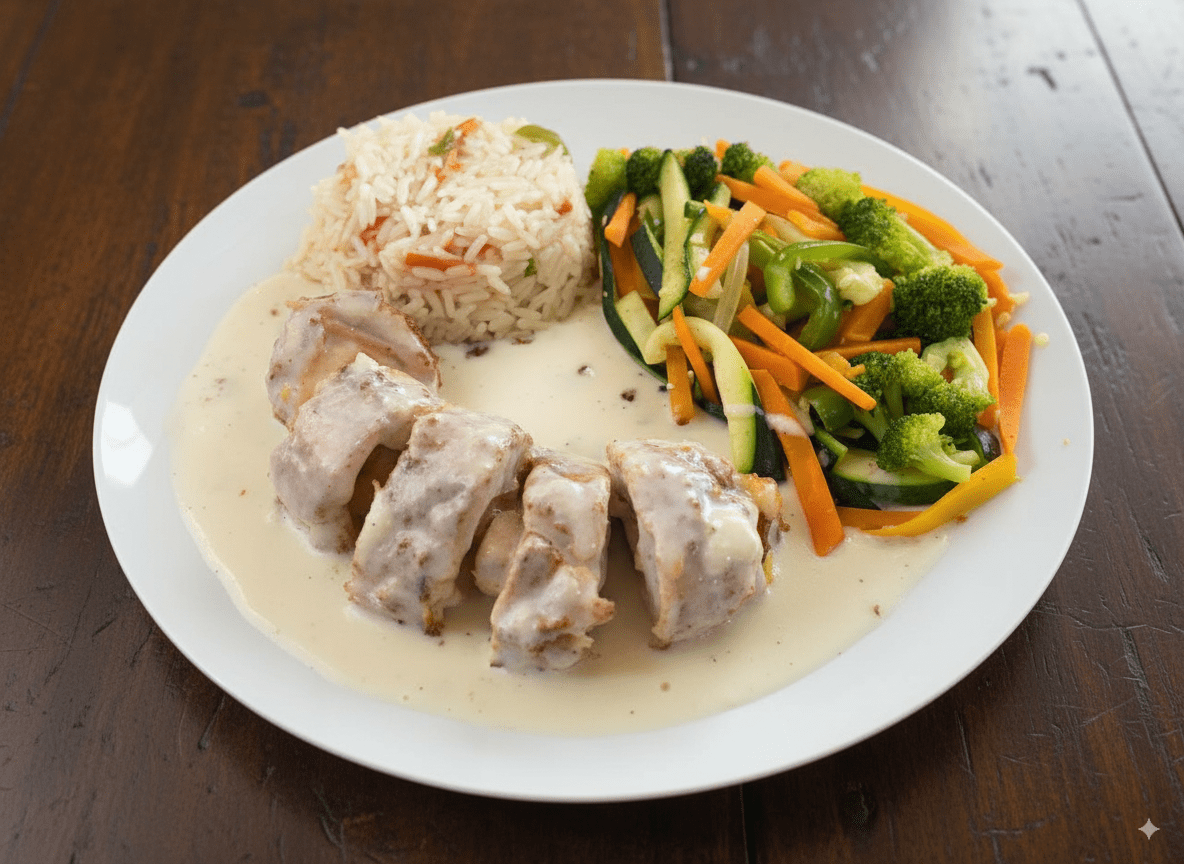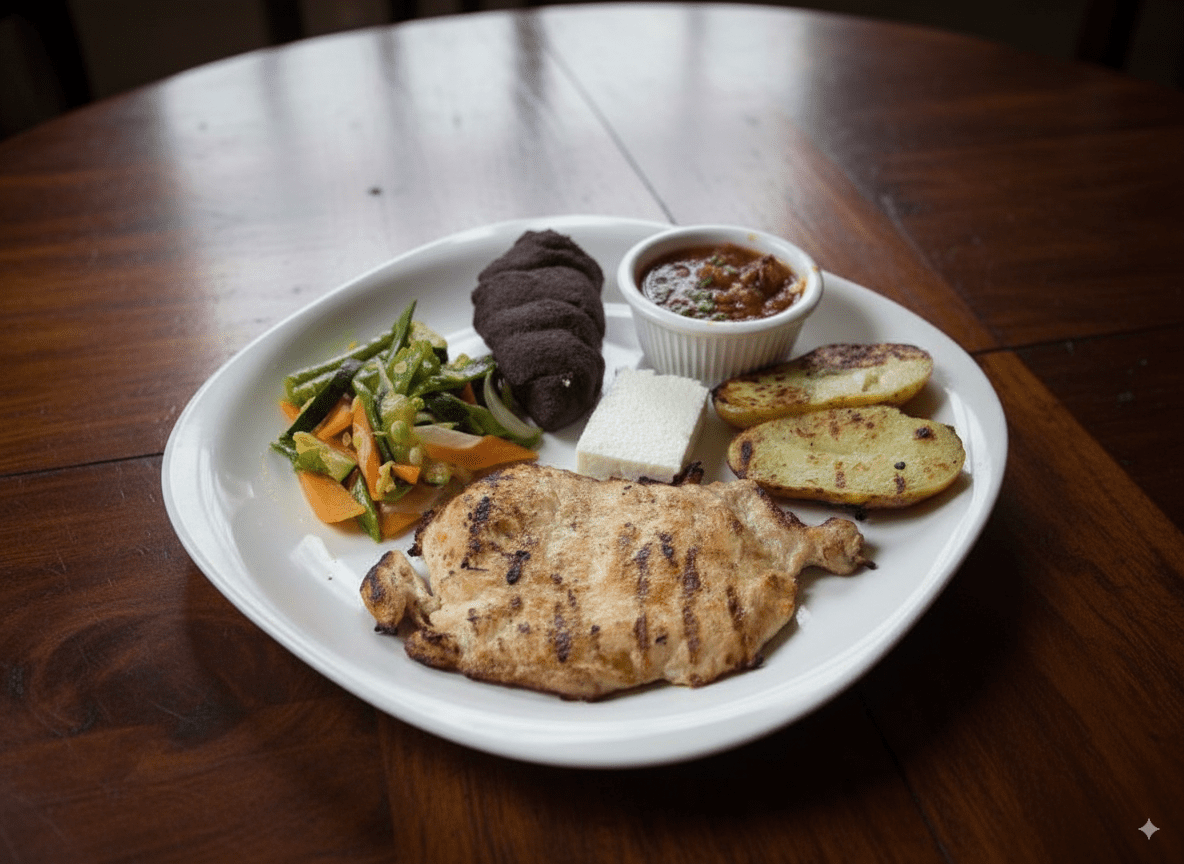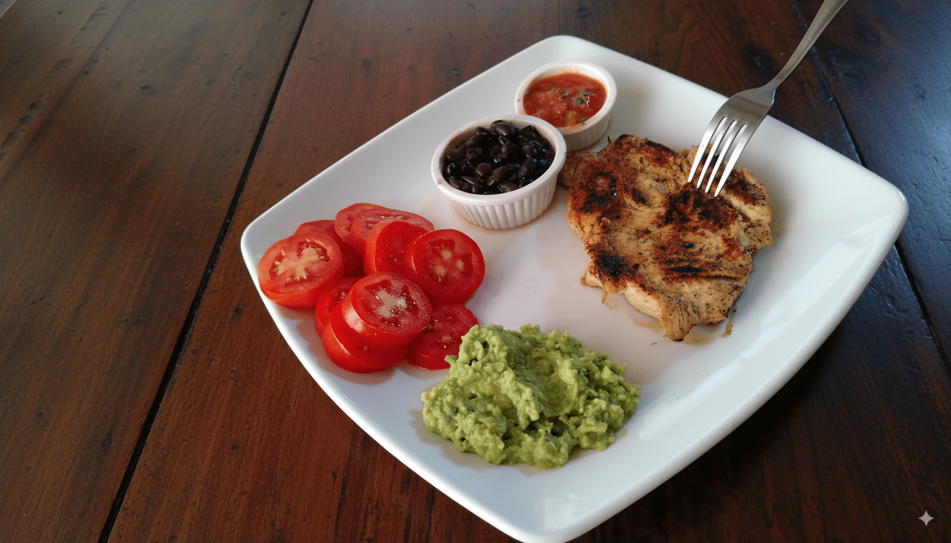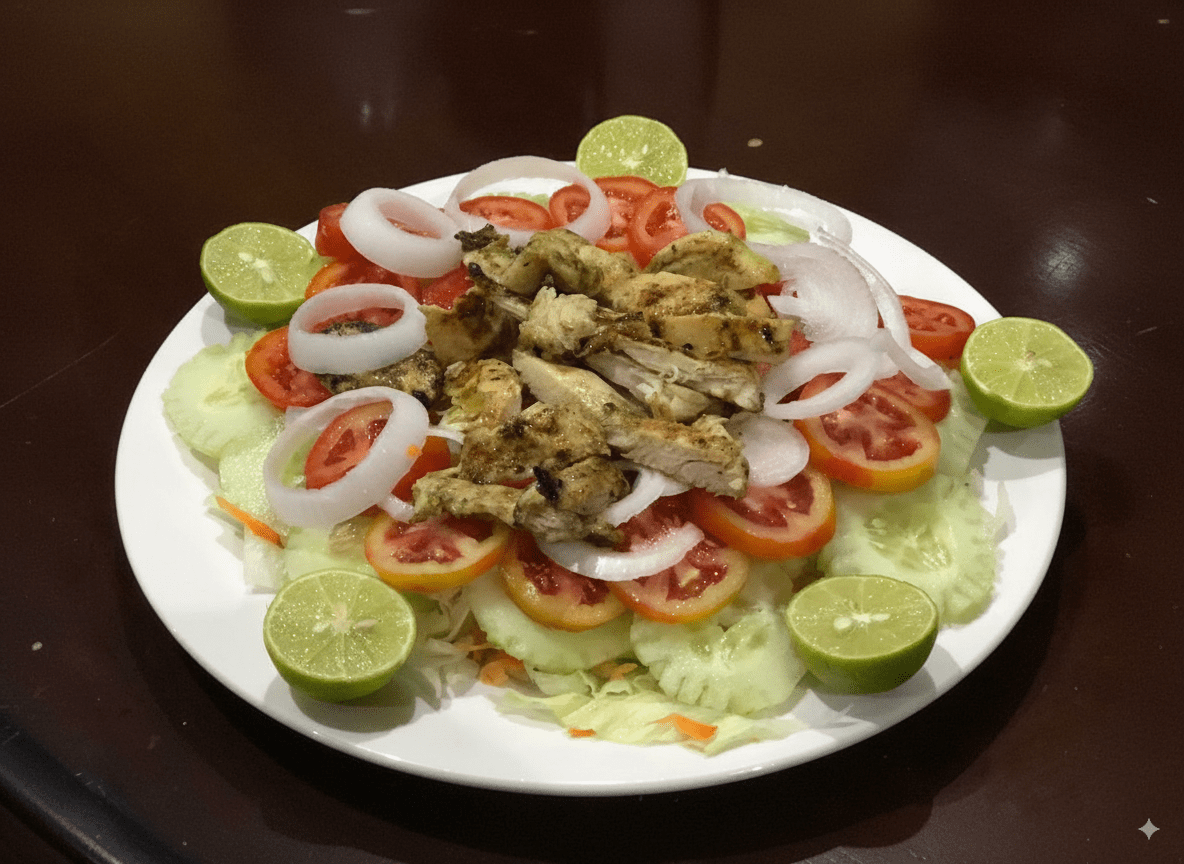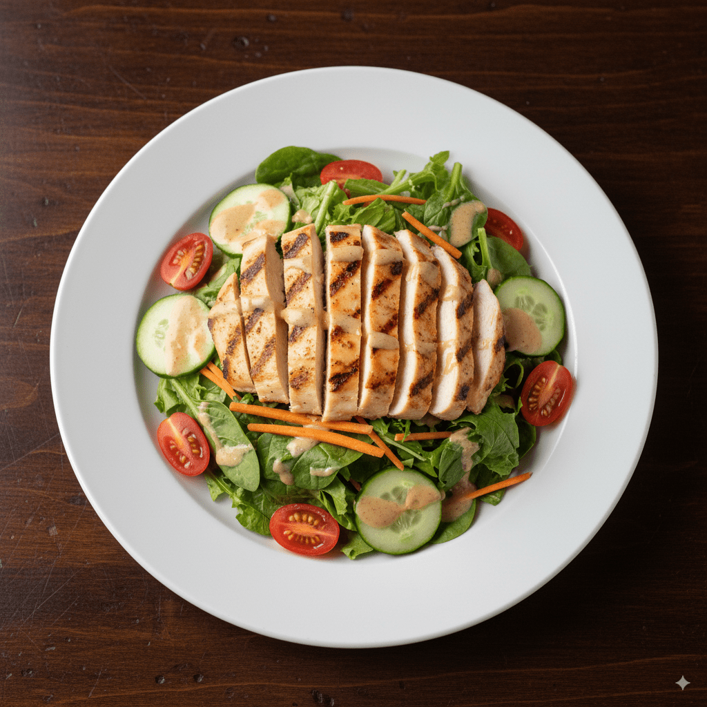 Pechuga de pollo a la plancha servida sobre una base fresca de vegetales con aderezo especial, perfecta para una comida ligera y balanceada.