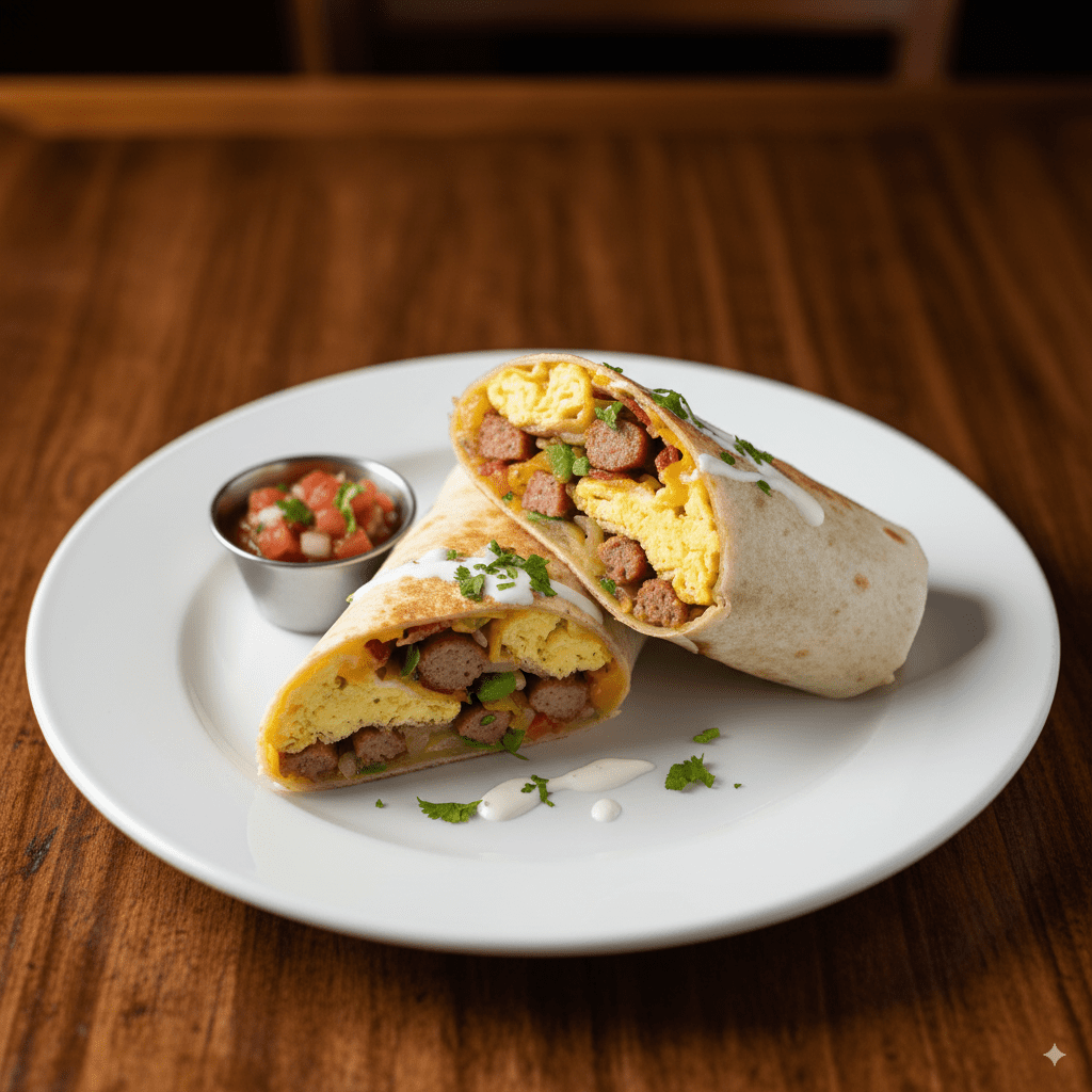 Tortillas de harina rellenas con huevos, carnes y vegetales, ideales para un desayuno práctico y lleno de sabor.
