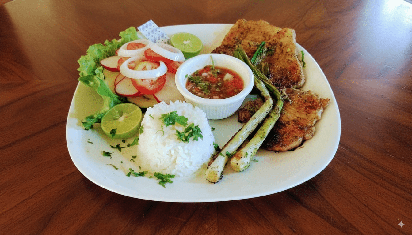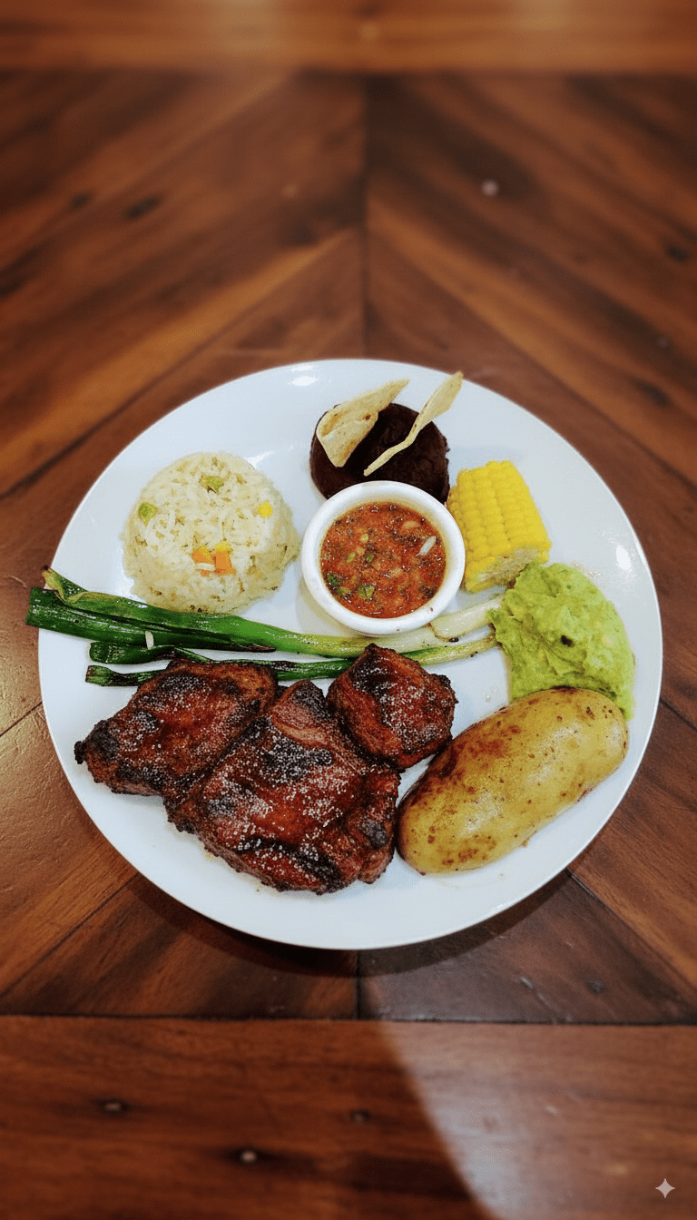 Filete de cerdo marinado en especias y asado al carbón para un gusto único.