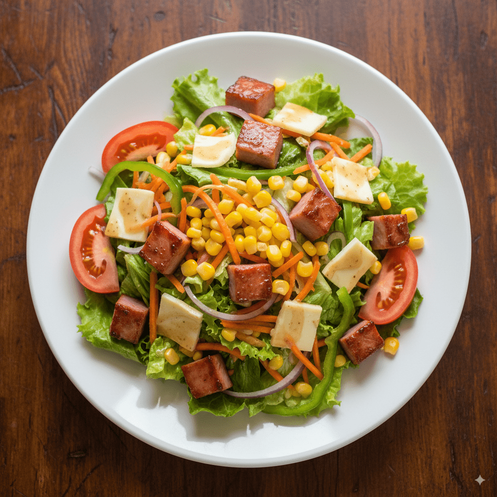 Mezcla sabrosa de jamón y queso con lechuga, zanahoria, maíz dulce, tomate, cebolla y pimiento, aderezada para realzar cada sabor.